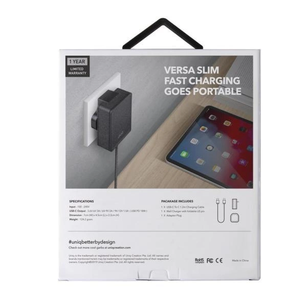 Ładowarka sieciowa UNIQ Versa Slim LITHOS Collective USB-C PD 18W + kabel USB-C / USB-C – czarna